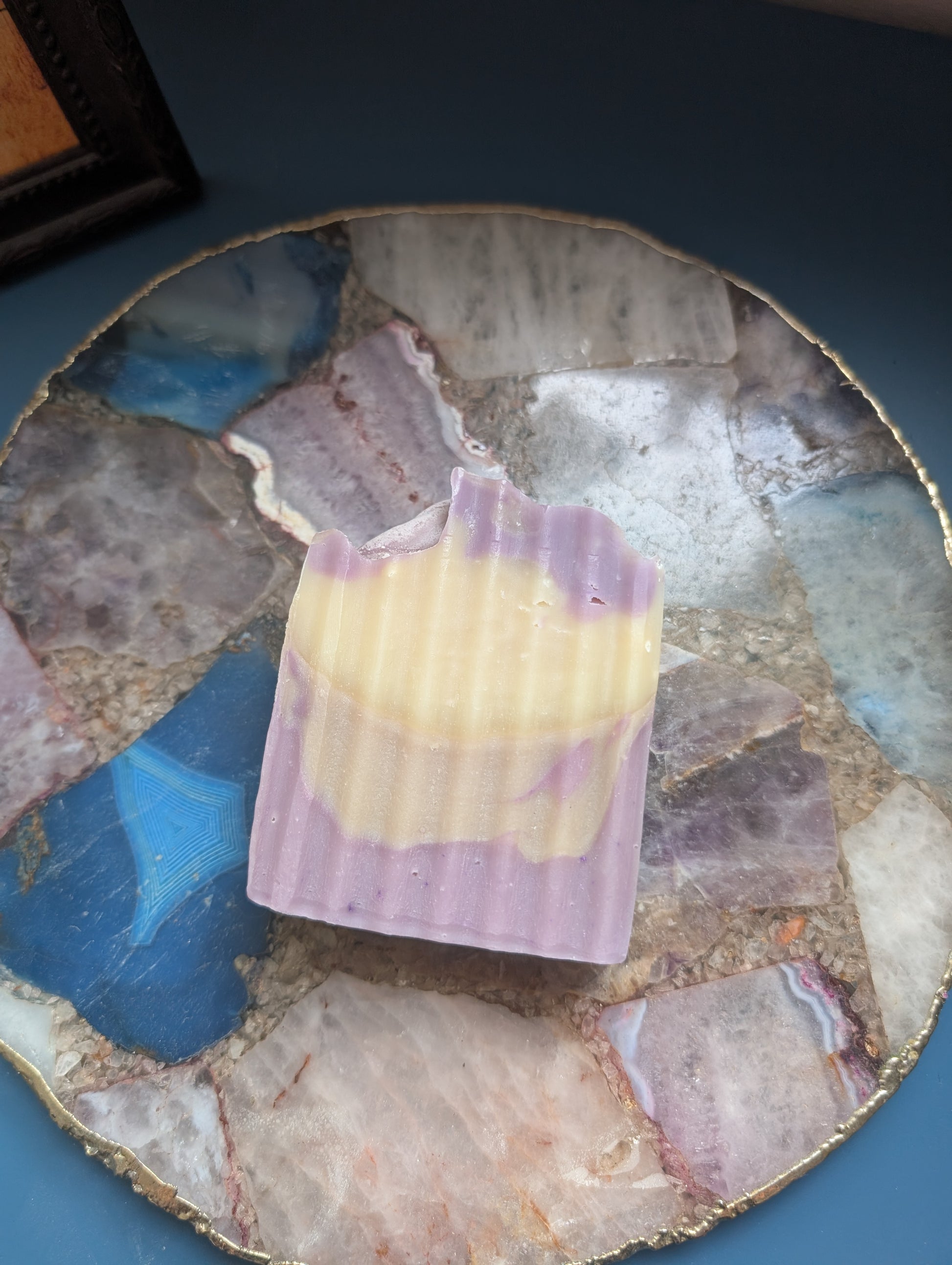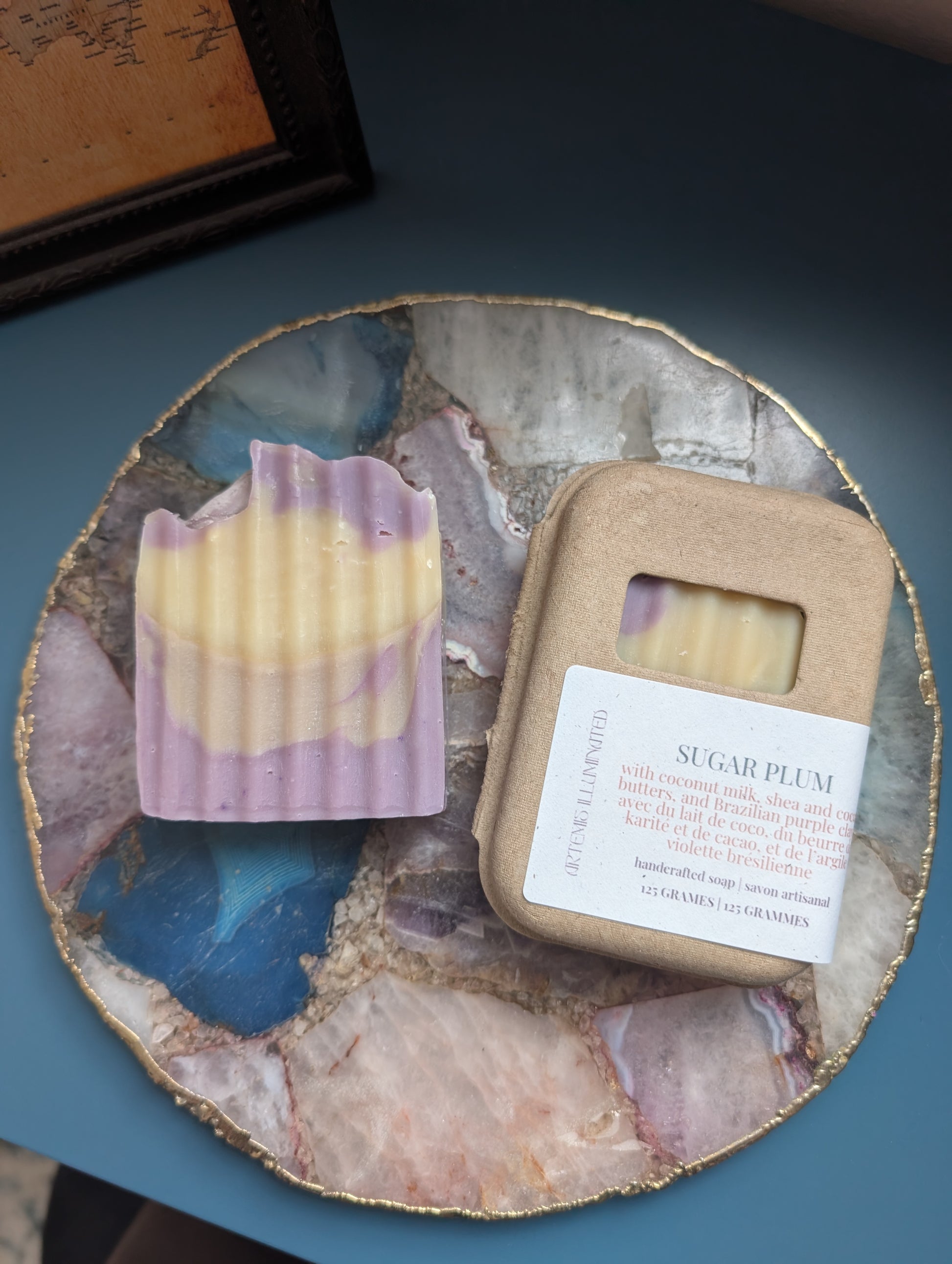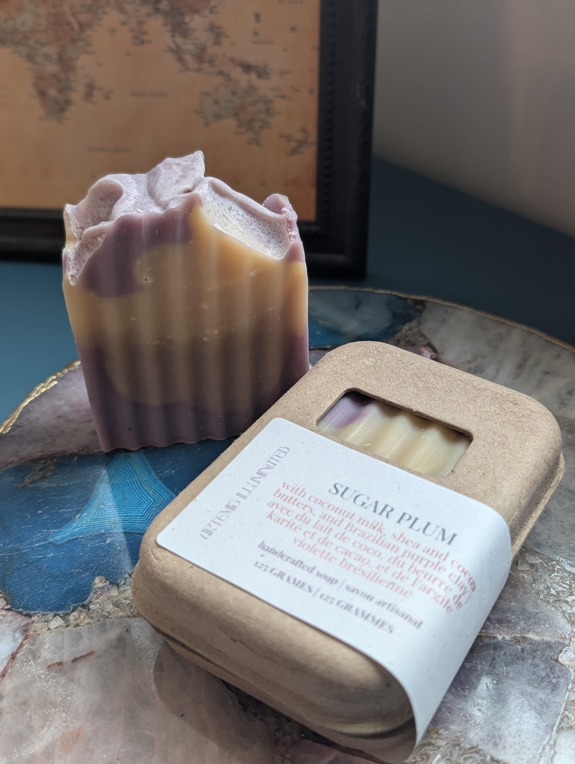 Delight in the sweet, fruity scent of plum with this luxurious handcrafted soap. Enriched with a blend of olive, coconut, shea, cocoa, avocado, and castor oils, it creates a creamy, moisturizing lather that leaves skin soft and nourished. Coconut milk adds extra silkiness, while Brazilian purple clay and mica lend each bar its beautiful, festive hue.